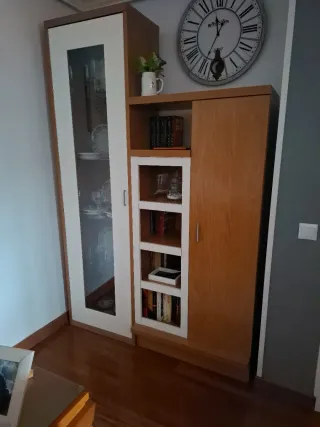 Conjunto de estanterías con vitrina, perfectas para organizar y exhibir tus objetos. - Estructura principal de madera. - Puertas de cristal para visibilidad. - se venden 2 módulos, cada uno mide 1,20 de ancho. Tiene puertas abajo y cajón y vitrina en el cuerpo superior