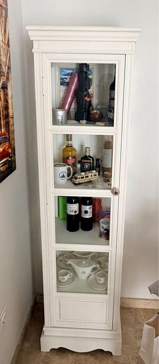 🪟 Vitrina estrecha blanca – Maison du Monde (2020) – Como nueva Vendo vitrina estrecha de Maison du Monde, comprada en 2020, en estado impecable, sin golpes ni marcas. La vendo únicamente porque me ocupa demasiado espacio. 🔹 Medidas: • Ancho: 44 cm • Fondo: 36 cm • Altura: 177 cm 🔹 Características: • Color blanco • Puerta con cristal • Varias baldas interiores • Ideal para vajilla, copas, botellas, libros o decoración • Diseño elegante y atemporal • Perfecta para salón, comedor o recibidor • Al ser estrecha, encaja muy bien en espacios pequeños 🔹 Estado: Muy poco uso, siempre bien cuidada. Está como nueva.