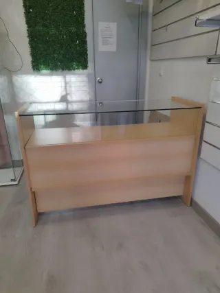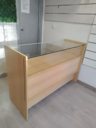 Mostrador de tienda con vitrina de cristal. - Diseño moderno y funcional. - Estructura de madera. - Superficie de cristal.