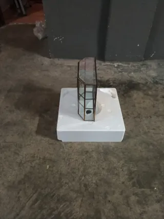 Elegante vitrina con estructura metálica y detalles dorados. Ideal para exhibir objetos decorativos. - Diseño hexagonal con múltiples estantes. - Paneles de cristal transparente.
