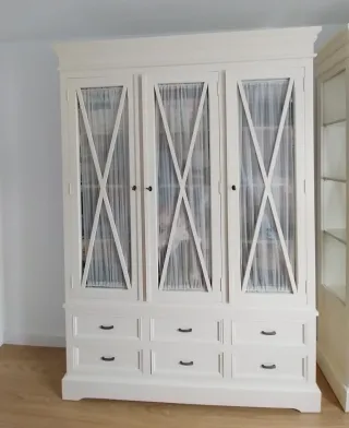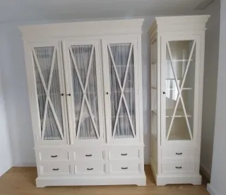 Conjunto de dos vitrinas de madera con puertas de cristal. Sólo se venden las dos juntas.Pago en efectivo .No se envían. Medidas grande: ancho 148cm,alto 210cm,fondo 37cm Medidas pequeña: ancho 58,5cm,alto 210cm,fondo 37 cm - Diseño clásico con detalles decorativos. - Puertas con divisiones en forma de X. - Cajones inferiores para almacenamiento adicional.