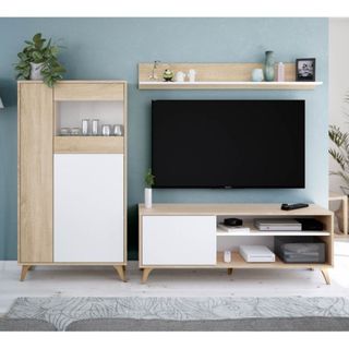 Mueble de salón con vitrina de cristal y detalles en madera. - Diseño moderno y funcional. - Combinación de colores blanco y marrón. - Estructura principal de madera. - Puerta de cristal para exhibir objetos.