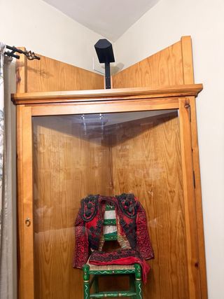 Mueble rinconera de madera con puertas de cristal. - Diseño curvo. - Estantes interiores. - Tirador decorativo. - Recoger en Córdoba.
