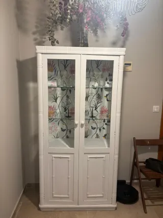Elegante vitrina con un diseño único y llamativo. - Acabado lacado en blanco. - Puertas de cristal para exhibir tus objetos. - Detalles decorativos en los laterales que simulan bambú.