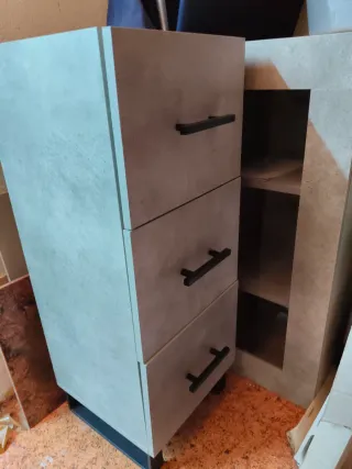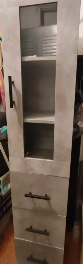 Vitrina con un diseño moderno y acabado que imita el hormigón. - Puerta con cristal. - Tirador negro. - Cajones inferiores. (No encajan perfectamente, falta ajustarlos un manitas)