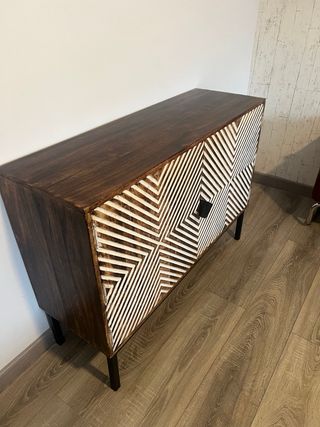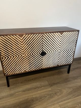 Aparador de estilo rústico de Kenay Home Está en perfecto estado, solo tiene un golpecito en las esquinitas. Una la he masillado y la otra tampoco se nota demasiado. Por lo demás está impoluto. Tiene un año. Precio en tienda sobre 450€ El mueble queda precioso en cualquier estancia Ese estilo rústico tipo envejecido con los tiradores de madera . 130cm largo X 35cm ancho X 87cm alto *Espejo no incluido*
