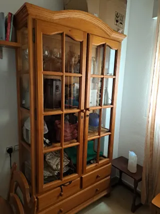 Vitrina de madera de pino en excelente estado. Ideal para exhibir objetos decorativos o vajilla. - Diseño clásico con puertas acristaladas. - Amplio espacio interior. - Cajones inferiores para almacenamiento adicional.