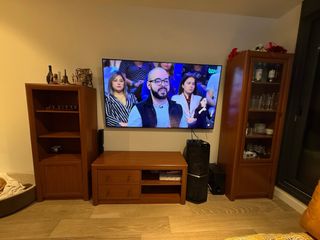 Mueble de salón de madera maciza con un diseño clásico y elegante. URGE vender por mudanza, buenisima calidad y estado, YA desmontado, solo venir y recoger - Puerta corredera con cristal decorado. - Compartimento para equipos electrónicos. - Cajones amplios para almacenamiento. - Estantería superior con varios huecos. - Vitrina lateral con espacio para botellas.