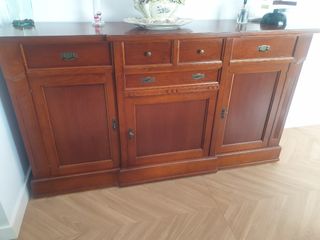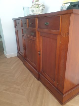 Elegante mueble de salón fabricado en madera de cerezo. Compuesto por: - Una vitrina. - Un aparador - Una mesa de seis comensales (ampliable a doce comensales). - Seis sillas - Una mesa baja