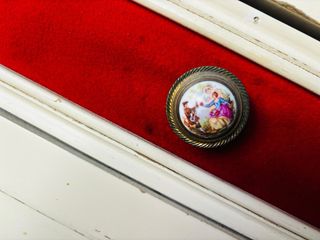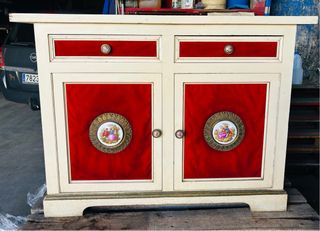 Mueble recibidor de estilo vintage con un diseño elegante. - Acabado principal en blanco. - Detalles decorativos en rojo. - Tiradores dorados. - Tiradores y detalles decorativos en porcelana. - Adornos circulares con escena. - Patas bajas. Mueble recibidor de estilo antiguo, con un diseño elegante y detalles únicos. - Estructura principal de madera. se vende en persona en valladolid ideal para dar toque personal medidas 110 ancho 30 fondo 79 alto