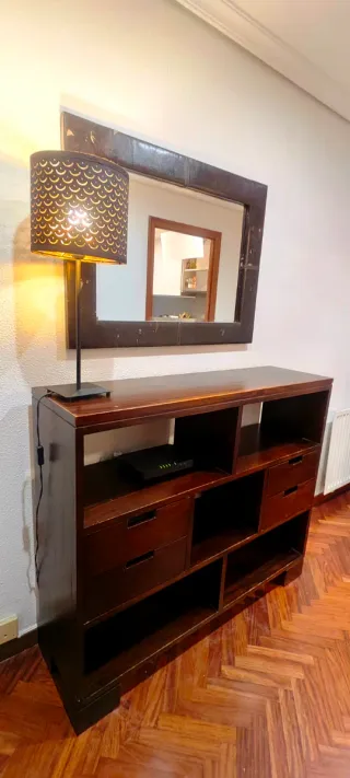 Se vende recibidor clásico de madera con espejo biselado en muy buen estado. 📏 Medidas: • Espejo: 118,5 cm alto x 99,5 cm ancho • Mueble: 73,5 cm alto x 104,5 cm ancho x 29,5 cm fondo • Altura total aproximada: 192 cm Mueble elegante y funcional, con cajón y armario inferior para almacenaje. El fondo es estrecho (29,5 cm), ideal para entradas o pasillos donde no se quiere ocupar mucho espacio. Se encuentra en buen estado general. 📍 Recogida en Vigo. #recibidor #muebleauxiliar #madera #clasico #vintage #espejo