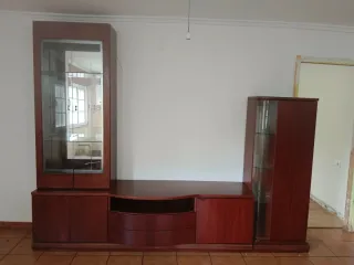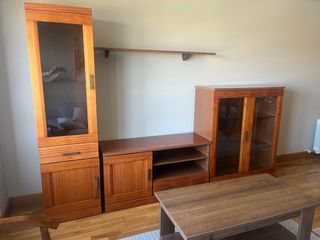 Mueble de salón de madera de cerezo con detalles en cristal. - Diseño elegante y funcional. - Acabado en madera de cerezo. - Puertas y estantes de cristal. Compuesto por mueble tv 1,20, vitrina con 2 estantes de crisral de 1,00m y mueble alto de 1,90x0,50 con estanterías y cajones ademas una estanterías de 1,36. Opcion a mesa de conedor con 4 sillas por 100€ En buen estado, vendo por cambio decoración. IRGE VENTA se aceptan ofertas