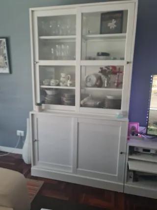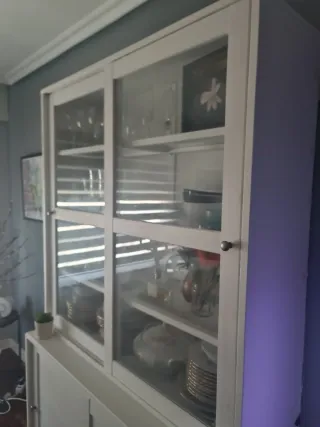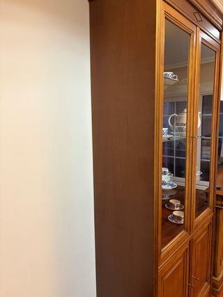 Vendo vitrina de madera maciza en muy buen estado, estilo clásico en tono miel. Características: 2 puertas superiores con cristal Baldas interiores de cristal 2 puertas inferiores de almacenaje Herrajes metálicos de estilo tradicional Mueble robusto y de gran calidad Ideal para salón o comedor, perfecta para vajilla, cristalería o decoración. Se vende por cambio de mobiliario. 📍 Recogida en domicilio (es pesada).