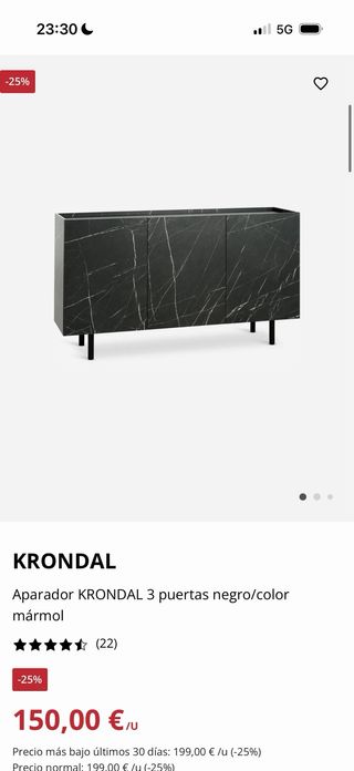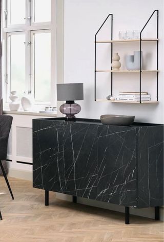 Elegante consola con un llamativo diseño que imita el mármol. - Acabado en negro con veteado blanco. - Patas negras finas. SIN USO. Faltan puertas por montar . NUEVO.