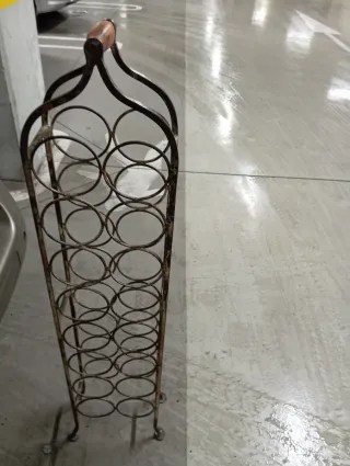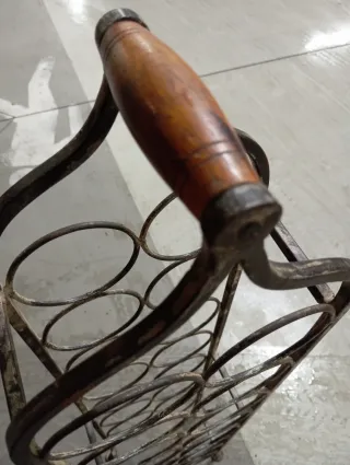 Elegante botellero de hierro forjado con detalles en madera. Su diseño vertical lo hace ideal para cualquier espacio. - Capacidad para varias botellas. - Estructura metálica robusta. - Asa superior de madera para facilitar su transporte.
