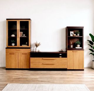 Mesa TV + 2 Vitrinas Salón Madera y Cristal
