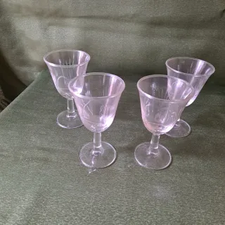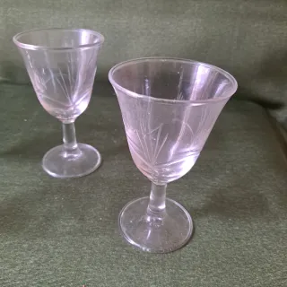 4 copas de cristal tallado antiguo, posiblemente diseñada para licor, vino dulce o jerez. Material: Cristal fino o vidrio, caracterizado por su transparencia y delicadeza. Diseño: Presenta un tallado floral o geométrico artesanal, típico de piezas vintage. Uso: Ideal para servir licores tras las comidas o como elemento decorativo en vitrinas. Antigüedad: Según características similares, podría tratarse de piezas producidas entre los años 40 y mediados de siglo 11cm alto