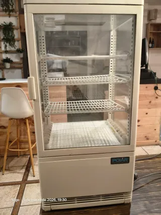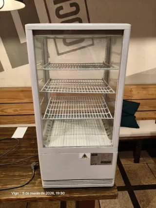 Vitrina expositora de cristal con estantes. - Para postres, funciona bien con luz arriba q abría que verificar. - Diseño moderno y funcional. - Ideal para exhibir productos.