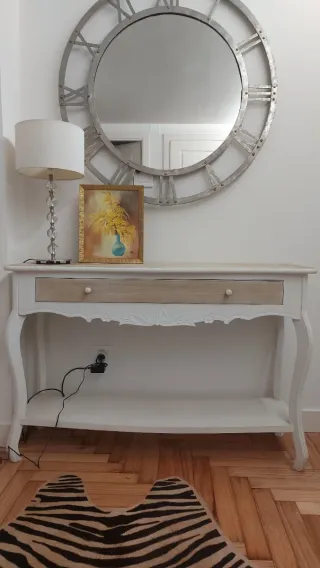 Mueble recibidor comprado en Westwing con un cajón. - Acabado en blanco y madera decapado. - Señales de uso normales