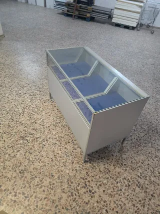 Mostrador tipo vitrina expositor con estructura de metal y superficie de cristal. - Diseño moderno y funcional. - Interior con revestimiento azul. Largo 120 Ancho 85 Alto 80 Negociable