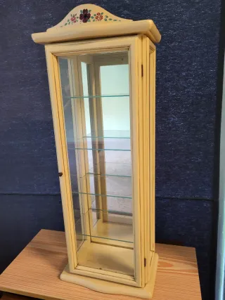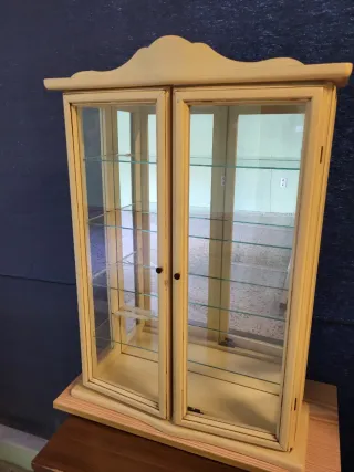 Elegante vitrina con puertas de cristal y estantes interiores. - Diseño de dos puertas. - Y otra con una puerta - Acabado en color beige. - Estructura de madera. Cada una 30€, juntas 50€ las dos