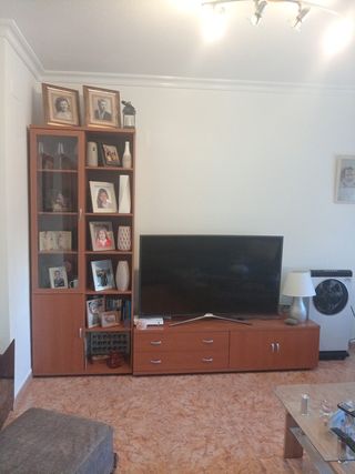Mueble de salón en muy buen estado, ideal para organizar tu espacio.Lo tengo muy cuidado. - Diseño moderno y funcional. - Acabado en madera clara. La media de la vitrina de alto, 1'96 y de fondo 79. Y del mueble de la tele de alto 1'60 de alto 37cm. El mueble va por separado, pero es el mismo mueble.