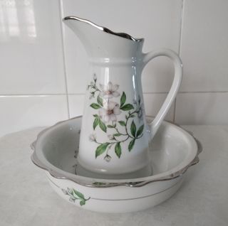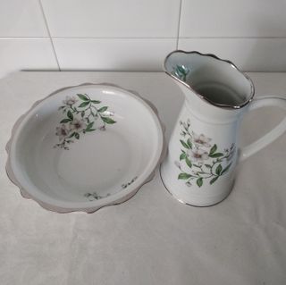 Conjunto de palangana y jarra de cerámica con un delicado diseño floral. El borde de ambas piezas está adornado con un detalle plateado. - Jarra con asa. - Palangana con borde ondulado. Jarra, altura 20 cm. y circunferencia en la base 10 cm. y la palangana circunferencia en la base 12 cm. y arriba circunferencia de 21 cm.