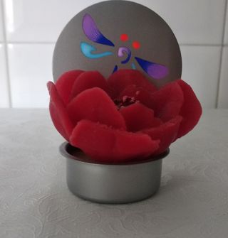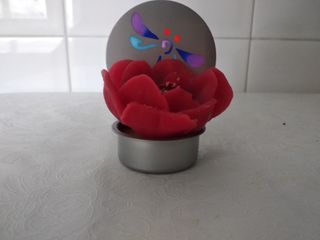 Este porta velas tiene un diseño con un detalle de libélula en la parte trasera y una vela en forma de flor roja. - El porta velas es de metal. - La vela tiene forma de flor roja. - El disco decorativo tiene una libélula con detalles en morado, azul y naranja. Medidas, alto 8 cm. y base 4 cm.diámetro.