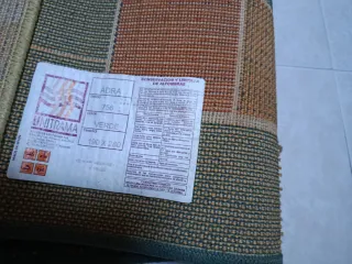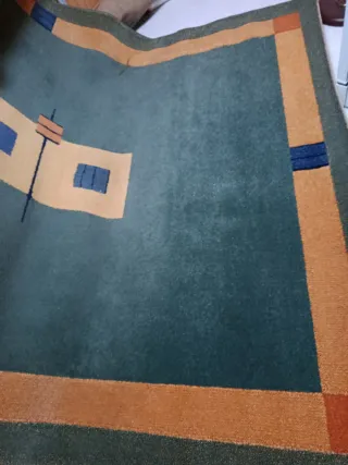Alfombra con un diseño moderno y geométrico. - Tonos verdes y naranjas. - Borde decorativo. - Ideal para dar un toque de color a cualquier estancia. Venta en mano