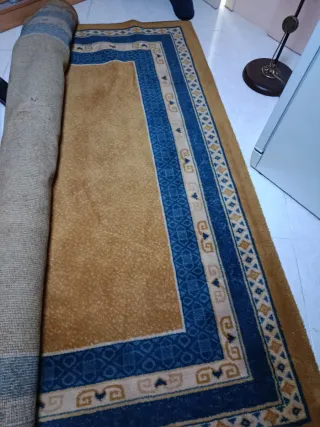Alfombra de diseño con borde azul y color mostaza.