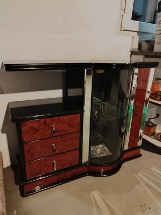 Elegante aparador de estilo clásico. Cuenta con un diseño atemporal y acabados cuidados. - Amplio espacio de almacenamiento. - Cajones con tiradores dorados. - Puerta lateral con detalle. Tiene un cristal protector que está agrietado, se podría cambiar o dejar en madera. Disponemos de transporte