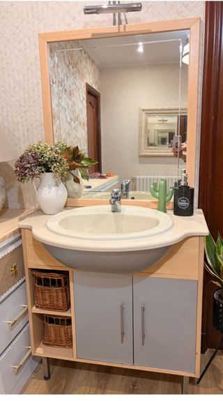 Mueble de baño de estilo clásico, en buen estado. Combina la calidez de la madera con el toque rústico del mimbre. - Diseño elegante y funcional. - Cestas de mimbre para almacenamiento. - Acabado en madera clara. Incluye grifo y espejo con luz