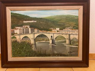 Preciosa pintura al óleo que representa una vista de Ourense con su puente y edificios. - Marco de madera. - Tonos marrones y verdes predominantes.