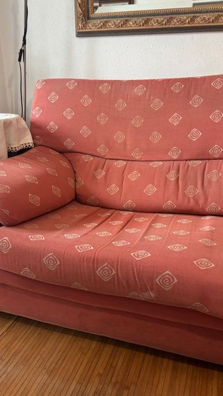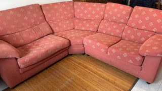 Sofá rinconera con un diseño moderno y cómodo. Tapizado en tela con un estampado sutil. - Tapizado en tela. - Color rosa-rojo. - Desmontable. Medidas aproximadas. Precio negociable. Para más información: contactar.