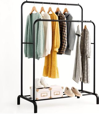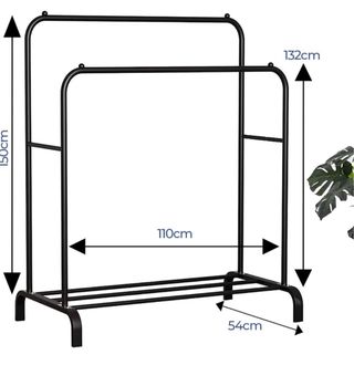 Práctico perchero burro de doble altura, ideal para organizar tu ropa. - Estructura de metal resistente. - Diseño de doble barra para colgar más prendas. - Base estable sin ruedas pero de facil movilidad. - Con soporte para zapatos -Facil montaje - Medidas: 150cm (alto) x 110cm (ancho) x 54cm (profundidad).