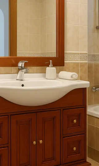 Mueble !!! Nuevo!! En su embalaje original. Precioso mueble de baño en madera maciza con espejo a juego . Si buscas darle un toque elegante y de calidad a tu baño, este mueble es perfecto. Fabricado en madera maciza, muy robusto y bien cuidado. Su diseño clásico aporta calidez y estilo a cualquier baño. Incluye: -Mueble de baño de madera -Lavabo cerámico amplio y cómodo -Espejo grande con marco de madera a juego. Varios cajones y armarios con gran capacidad.