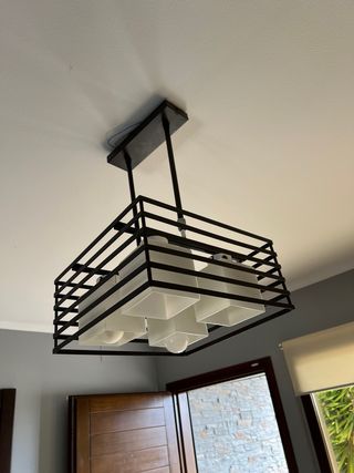 Conjunto de tres lámparas de techo con un diseño moderno y elegante. - Estructura exterior en forma de jaula. - Pantallas interiores cuadradas. 2 lámparas cuadradas de 4 bombillas 1 lámpara de tres bombillas Las dos cuadradas están todavía colgadas, la recta la hemos quitado y olvidé hacerle foto colgada. Son el mismo estilo combinado en dos modelos diferentes. No incluyo bombillas RECOGIDA EN JIJONA (Alicante) NO LAS ENVÍO