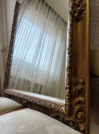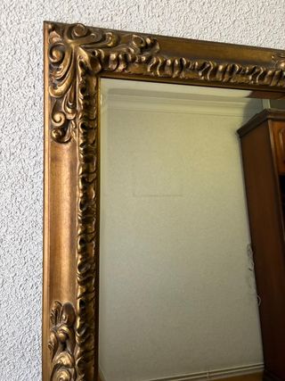 Elegante espejo con marco de madera tallada y acabado dorado. Cristal biselado de alta calidad.