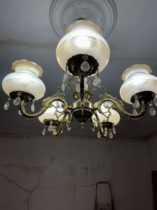 Lámpara de techo vintage con un diseño clásico y detalles ornamentales. - Acabado en tono dorado. - Farolillos de cristal translúcido. - Adornos de cristal colgantes.