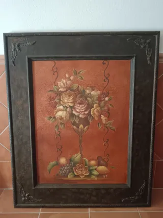 Precioso cuadro decorativo con un diseño floral. Se trata de una pintura al óleo de naturaleza muerta. El cuadro presenta un arreglo floral en tonos cálidos, con rosas y otras flores en un jarrón estilizado. La composición incluye frutas como uvas, peras y manzanas en la parte inferior, sobre un fondo de color terracota o anaranjado con textura. Está enmarcado en un marco oscuro de estilo clásico con adornos tallados en las esquinas. La pieza es un artículo decorativo para pared, clasificado como arte elegante y exclusivo.