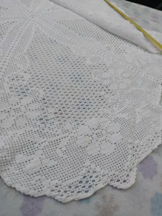 Elegante mantel redondo tejido a mano con ganchillo. - Diseño intrincado con motivos florales. - Acabado blanco clásico. - Aporta un toque delicado a cualquier mesa. - 86 cm de diámetro en el borde mas corto