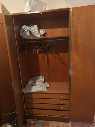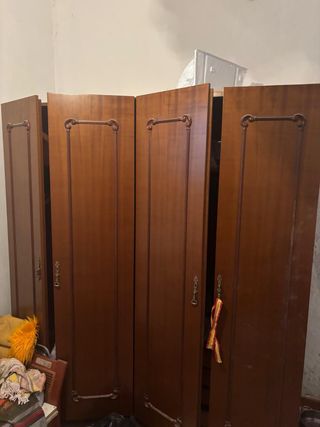 Armario de madera con un diseño clásico y elegante. - Puertas con detalles ornamentales. - Tiradores metálicos. - Acabado en tono marrón.