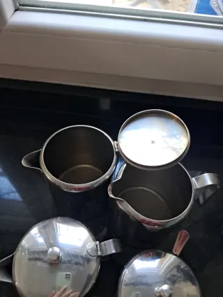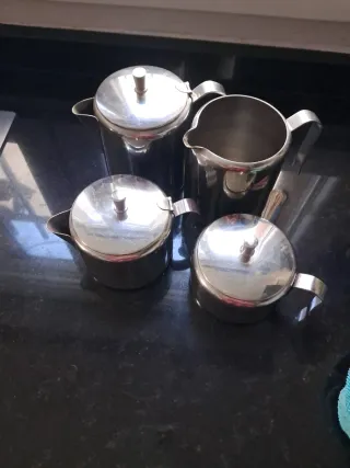 Conjunto de recipientes de acero inoxidable con un diseño clásico. Conjunto de cafetera, lechera,tetera y azucarera con cuchara. Muy clásico