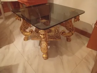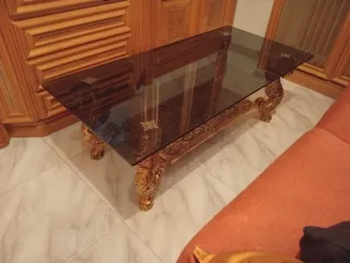 Conjunto de dos mesas de centro con un diseño elegante y moderno. - Estructura de madera con detalles dorados. - Superficie de cristal transparente. - Altura 43cm. - Mesa grande 120*57 cm; mesa pequeña 60*60 cm. - Entrega en mano en Móstoles.