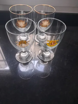 Set de 4 copas de cerveza de la marca Grimbergen. Perfectas para disfrutar de tu cerveza favorita. - Diseño elegante con borde dorado en dos de ellas. - Logo de Grimbergen en relieve.