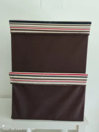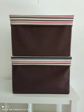 Conjunto de cajas de tela para organizar y almacenar objetos. Creo que son de Ikea Medidas en las fotos - Diseño con rayas multicolor en el borde superior. - Tejido resistente y duradero.