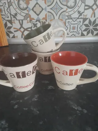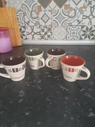 Conjunto de cuatro tazas de cerámica con un diseño moderno. - Tazas con la palabra Café impresa. - Interior en contraste de color.