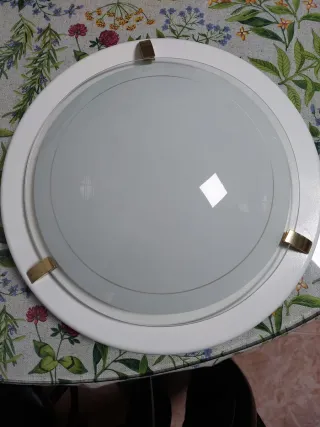 Lámpara de techo tipo plafón con un diseño moderno y elegante. - Acabado en color blanco y detalles dorados. - Cubierta de cristal. - Base metálica. -Casquillo E27 -Incluye bombillas led -Tengo dos unidades si quieres los dos 16 euros