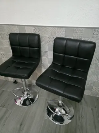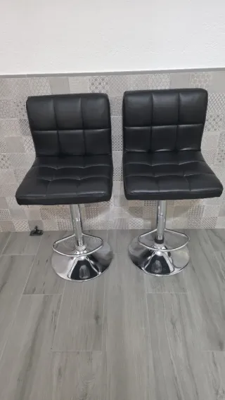Conjunto de dos taburetes modernos y elegantes. - Asientos acolchados. - Base y pie de metal cromado. - Diseño giratorio y regulable en altura.