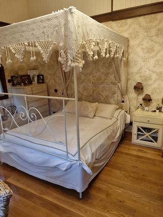 Cama de 200x 150, con estructura de forja y con cortinas decorativas y faldón.